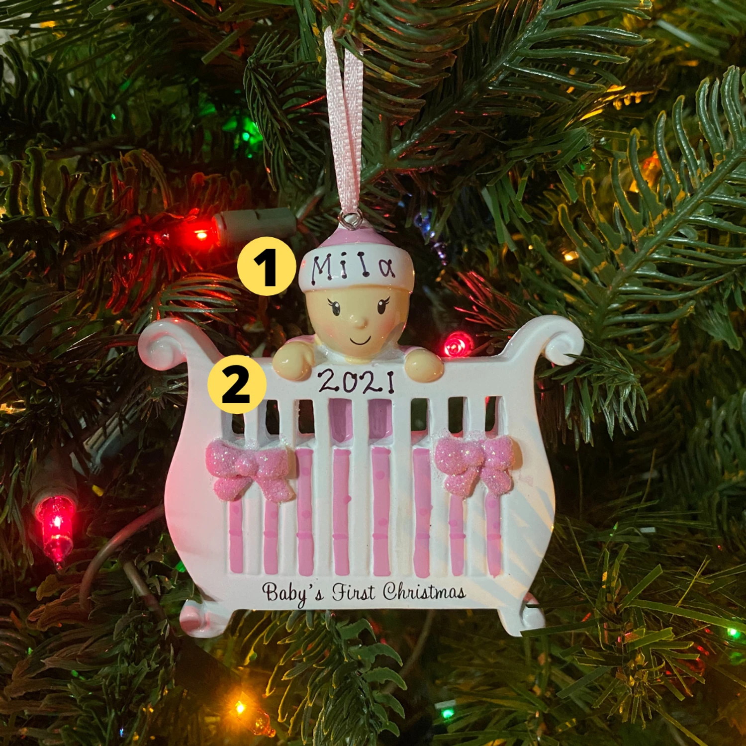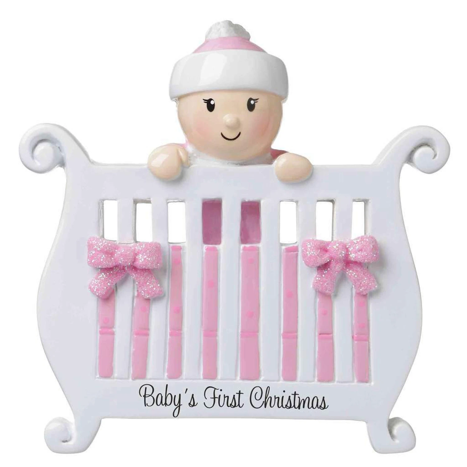 Welcome the newest member of the family this Christmas with this ornament! It features a white crib with a pink crib liner and pink bows with a smiling baby popping over the top! Get your baby’s name written on the baby’s hat and the year on the crib! Made of resin. Dimensions: 3.5″ x 3.5″. Item #: OR1732-P
