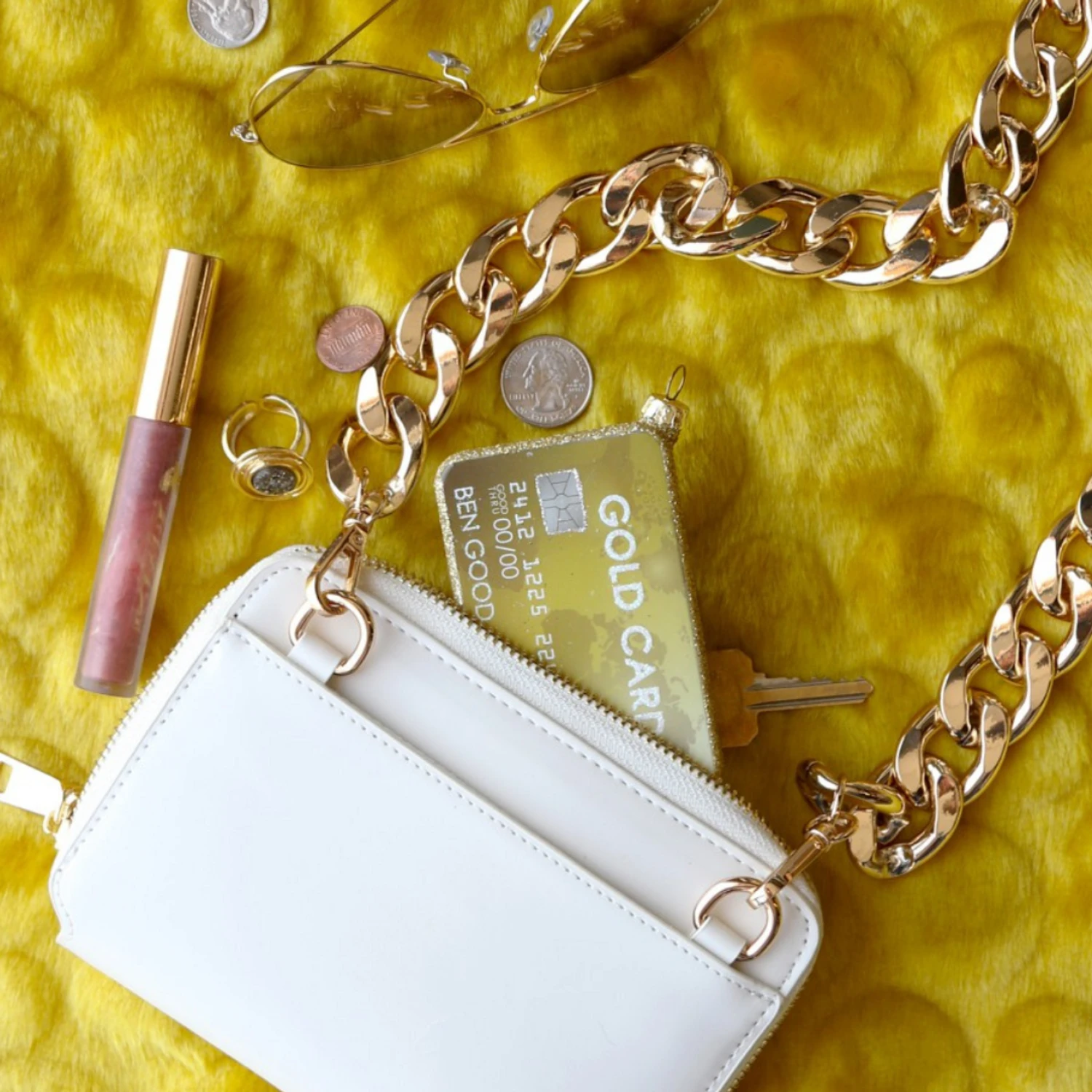Time to flash that gold this holiday season! This ornament is perfect for those big spenders- it features a gold glitter credit card with the name “Ben Good” on the card! Made by Cody Foster. Made of glass. Dimensions: 3.75″L x .75″W x 2.5″H. Item #: GO-9921