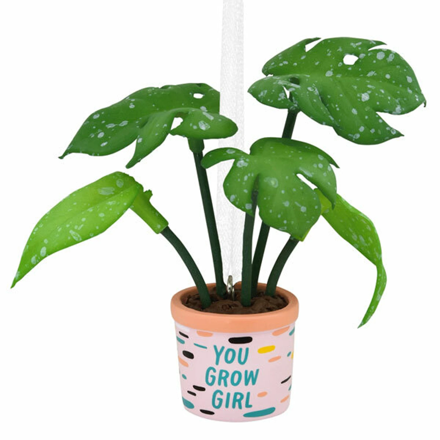 Plant ladies and dudes UNITE! This ornament features a colorful pot that reads “You Grow Girl!” on the front with a large variegated monstera snuggled planted in the pot! Perfect for any plant lover on your Christmas list! Made by Hallmark. Made of resin and polyester. Dimensions: 1.8″ x 3″ x 3″. Item #: 1HGO2809