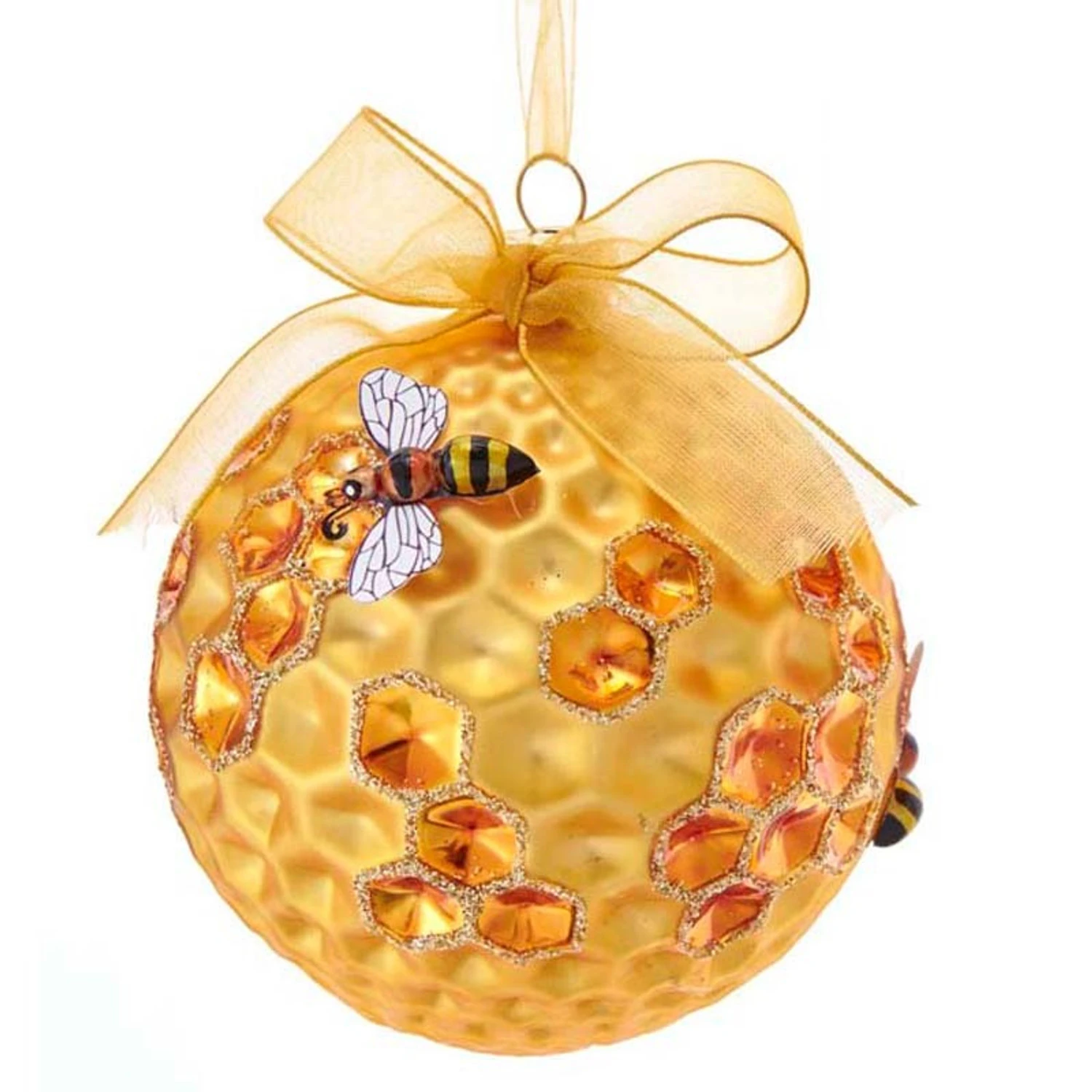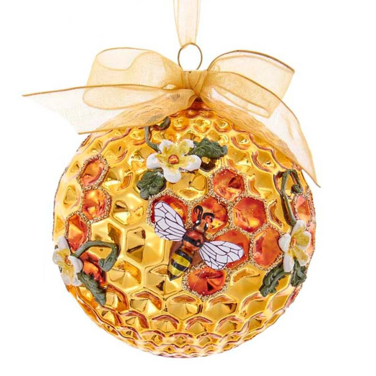 Give a gift to your fellow bee lovers or someone who farms bees! These adorable ornaments feature a golden honeycomb in a circular shape with tiny bees crawling around and golden glittered hexagons! Each sold individually. Made by Kurt Adler. Made of glass. Dimensions: 3.5″ ball ornament. Item #: T2702