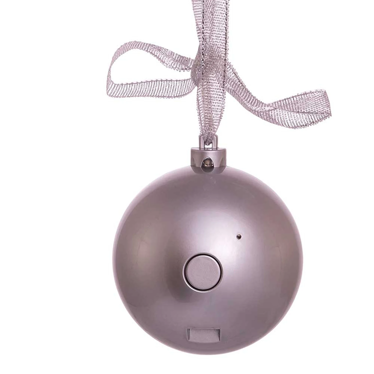 Discreetly play your favorite Christmas music this holiday season with this awesome decoration! It features a silver ball ornament that connect to your phone and hangs on your tree to play songs so your guests can sing along! Speaker connects via bluetooth, directions included in package. Made by Kurt Adler. Made of plastic. Dimensions: 75MM ball ornament. Item #: USB1300