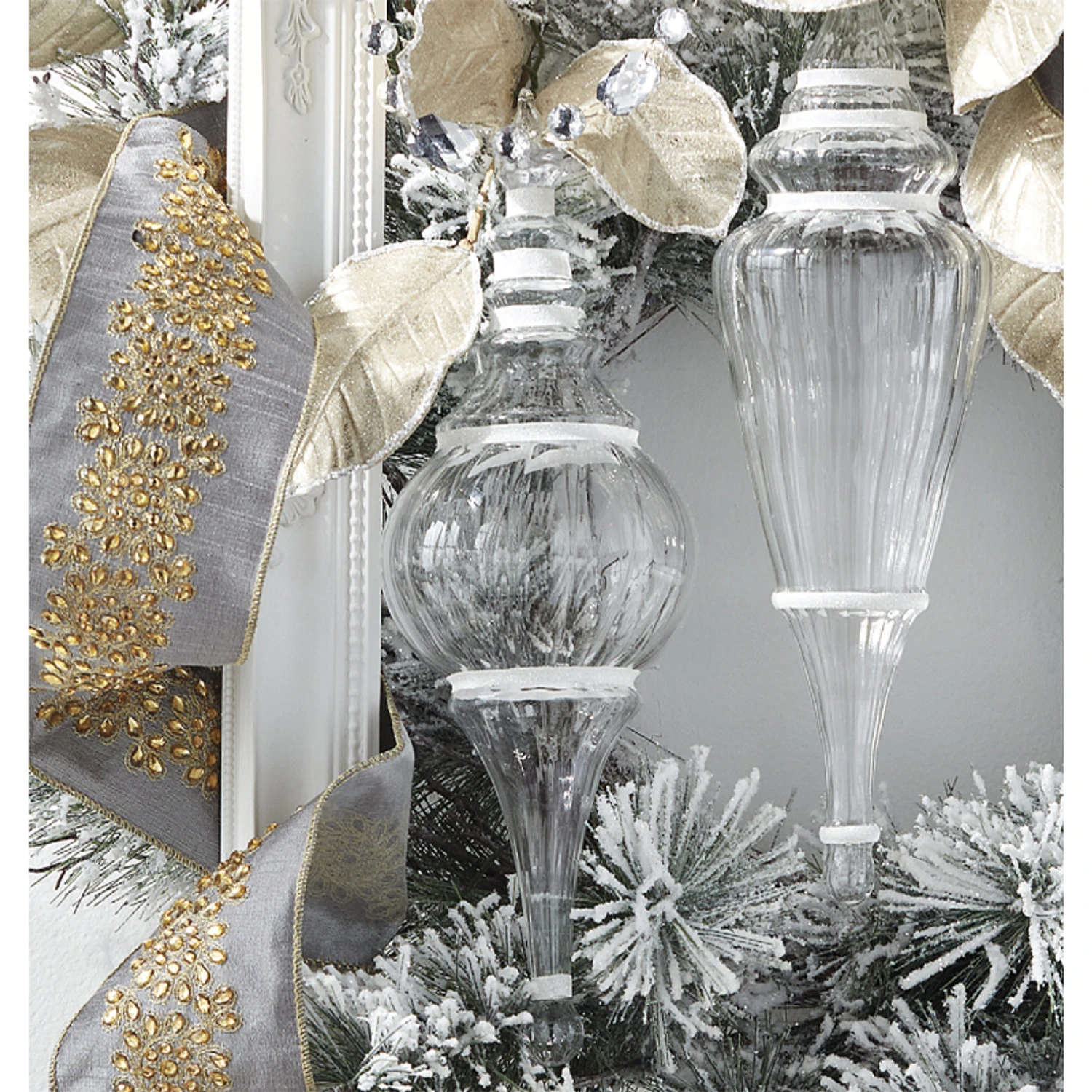 These stunning finials feature clear glass with white glitter stripes! They are sure to sparkle on your tree this holiday season! Each sold individually. Made by Raz Imports. Made of glass. Dimensions: 15.5″ tall. Item #: 4224530
