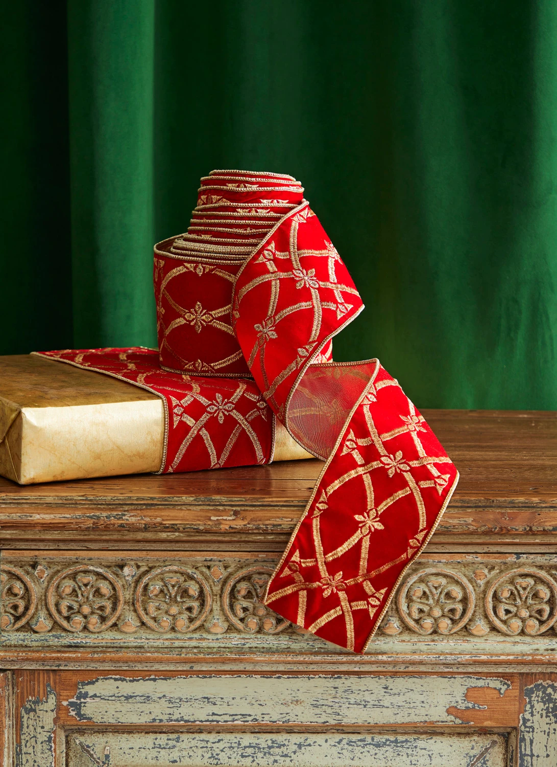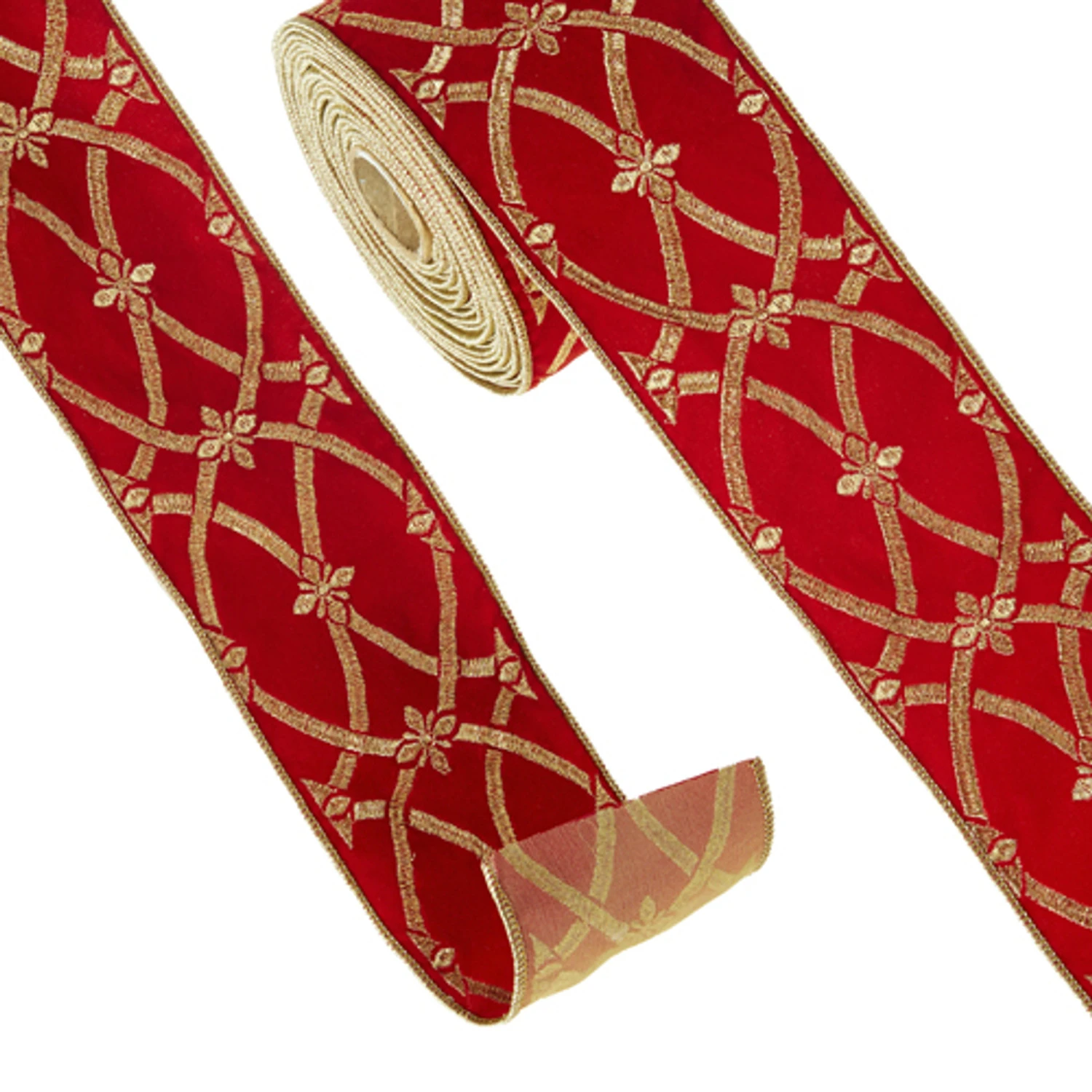 Deck the halls with this gorgeous ribbon! It features a bright red fabric with a gold metallic pattern down the length of it! Made by Raz Imports. Made of polyester. Dimensions: 4″ x 10 yards. Item #: R4327721