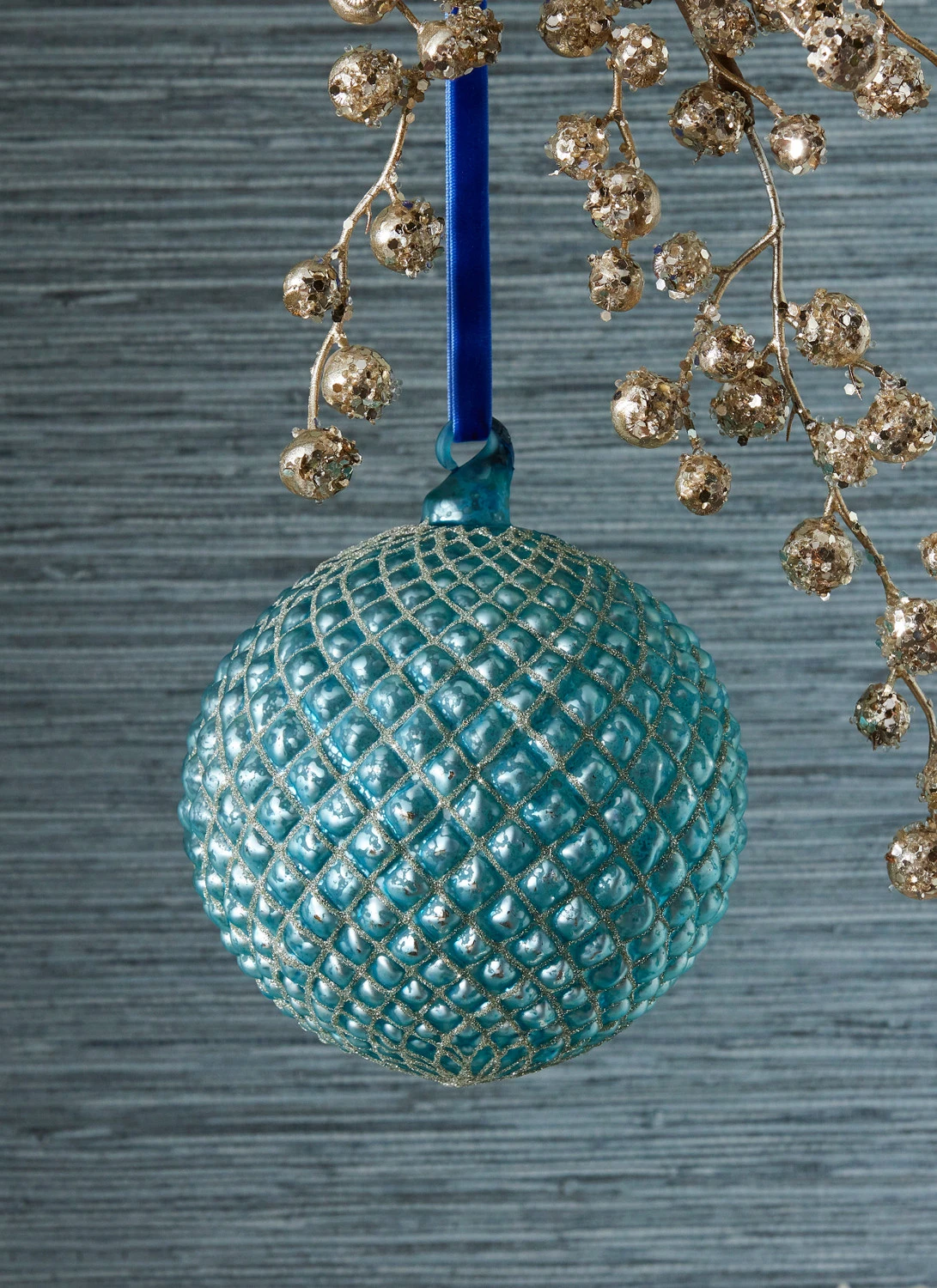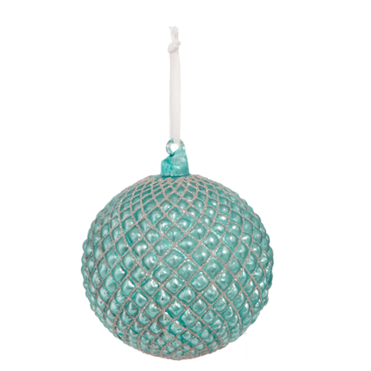 This stunning blue ornament features a unique quilted design with sparkling silver glitter in the grooves! Made by Raz Imports. Made of glass. Dimensions: 6″. Item #: 4322938